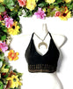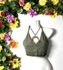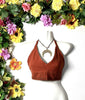 These handcrafted halter crop tops are made from a natural jute-cotton blend that feels raw yet soft against the skin. Each top features a hand-stamped tribal border in natural dye tones.